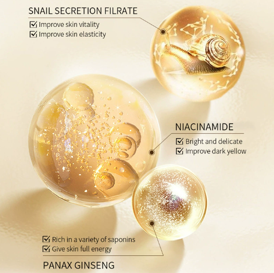 Snail Secretion Filtrate: Renowned for its regenerative properties, it deeply hydrates, soothes irritation, and repairs damaged skin for a smoother, more elastic texture.